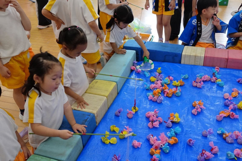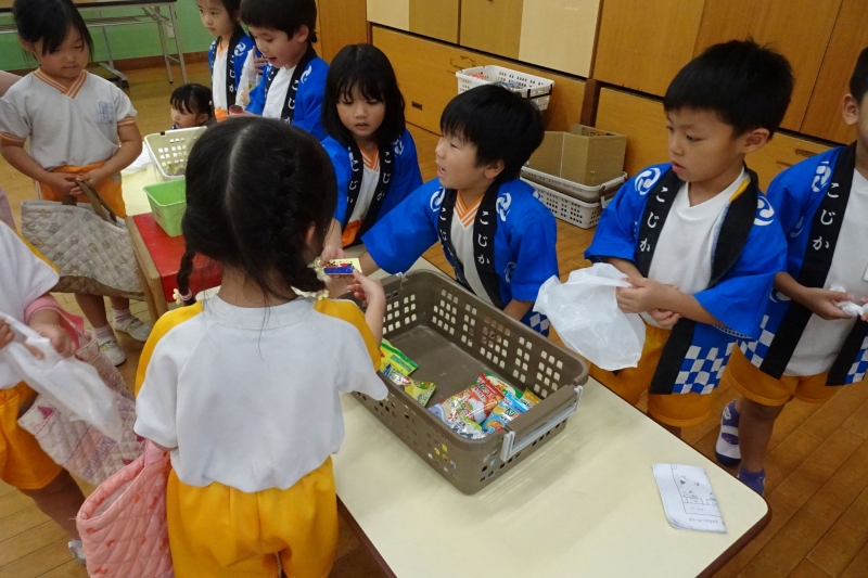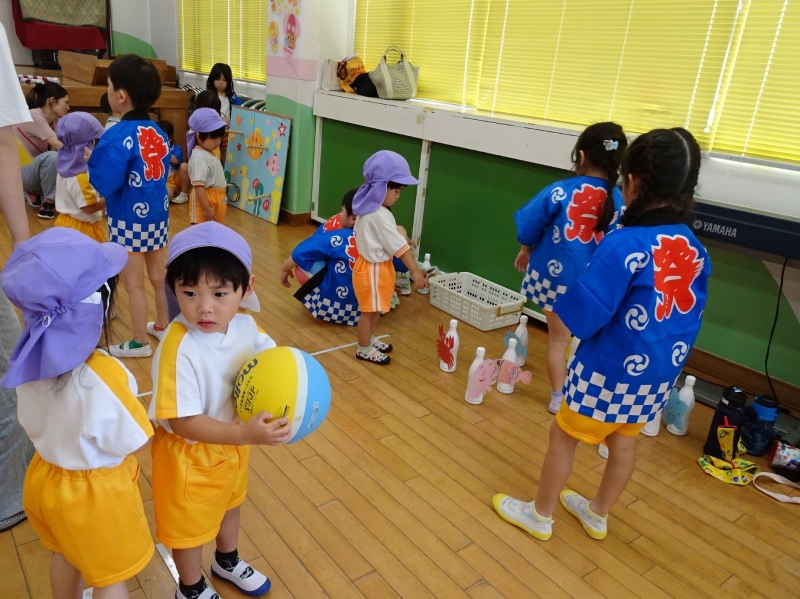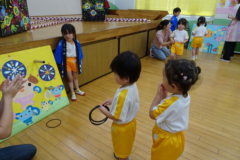 その後、年長組の子ども達が係になって、ホールであそびコーナー(ボーリング、輪なげ、ゼリー釣り、ボール入れ)、くじ引きなどをして楽しみました。とっても楽しいお祭りでした♪