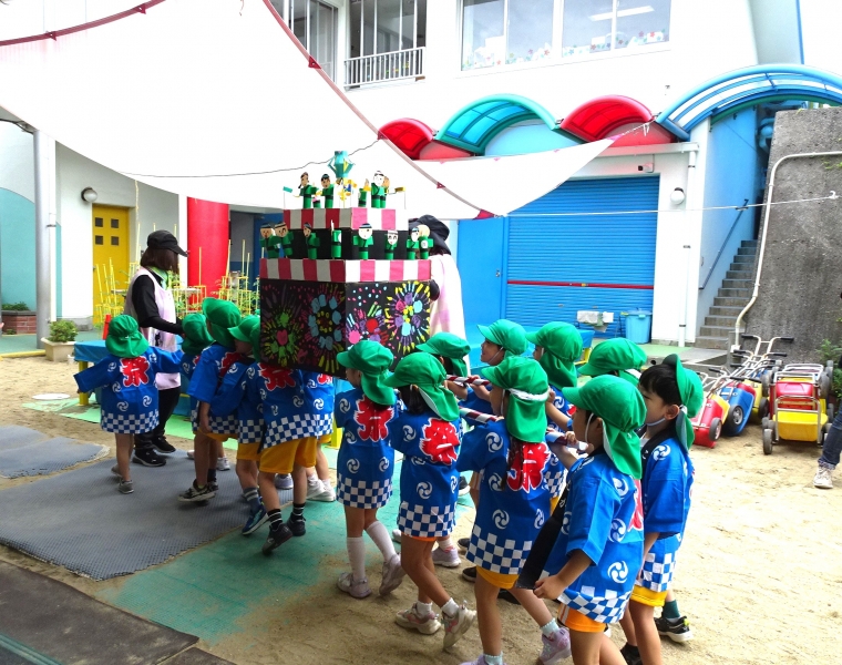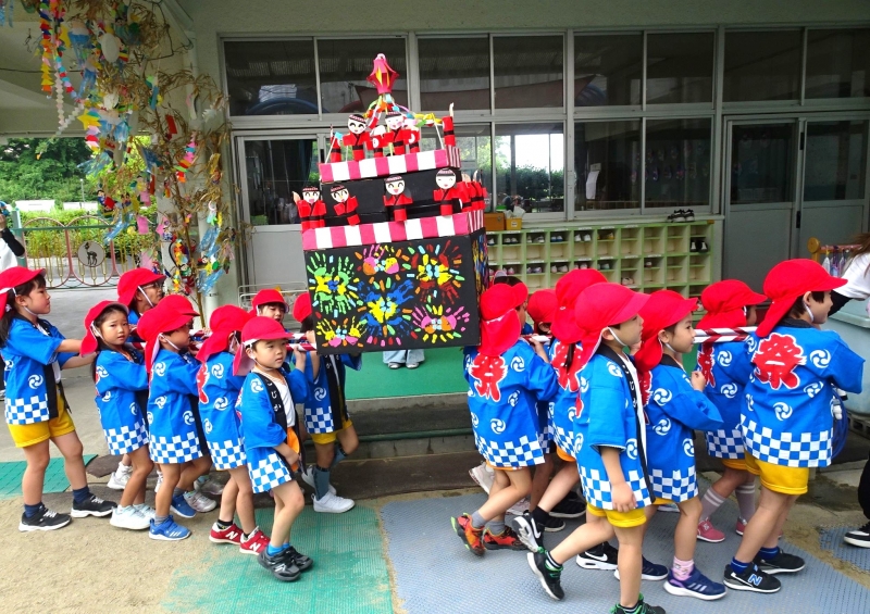 こじか夏まつりが行われました。「わっしょい!」「わっしょい!」園庭から年長組さんがお神輿をかついて練り歩く、活気ある声が響きわたりました。