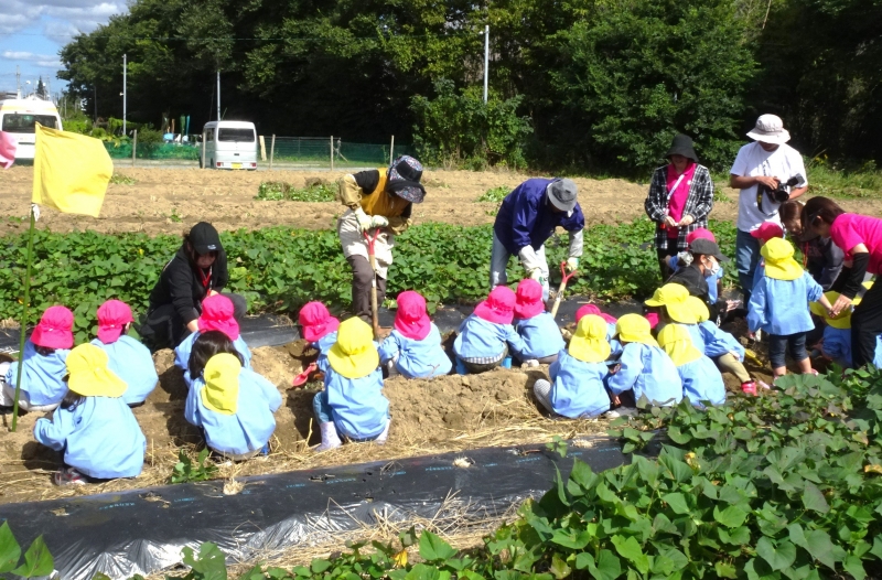 「どこかな?」「あったー!」「こっちもある!」といいながら、子ども達は一生懸命おいもを夢中になって掘りました。「たのしかったね。」「おいも早く食べたいね!」初めてのおいもほりは、笑顔いっぱい大満足の子どもたちでした。