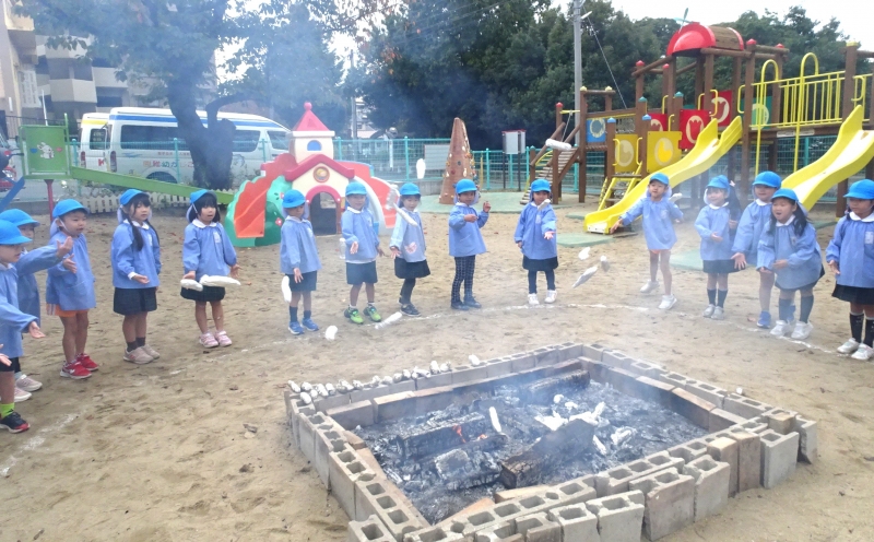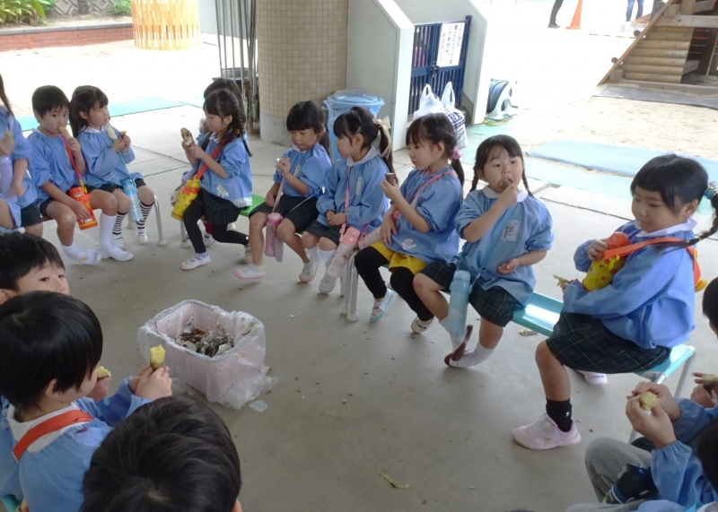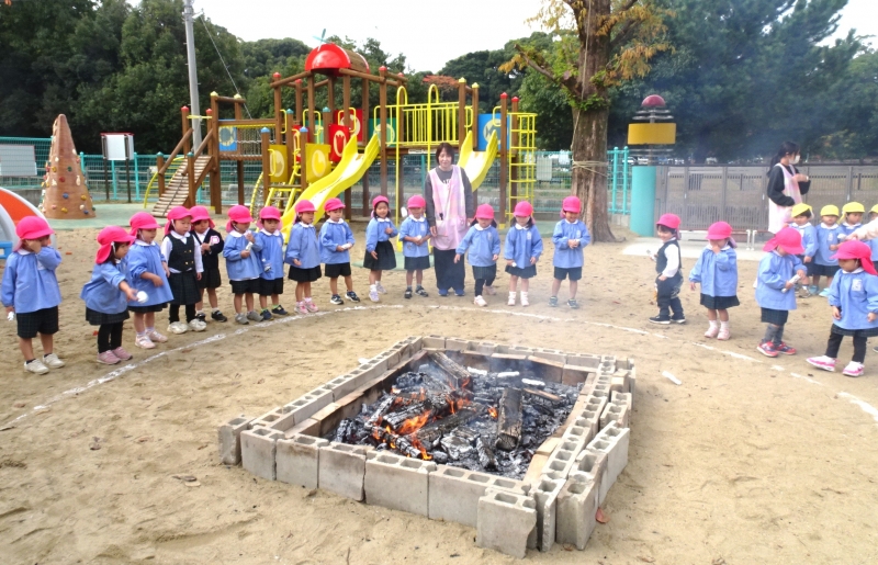 全園児、焼きいも作りを行いました。おいもを新聞紙とアルミホイルで包み、下準備のできたおいもを熱いかまどにそっと入れました。おいしいおいもになりますように♪とみんなでお願いをしました。焼き立てのおいもはとっても美味しかったですね!