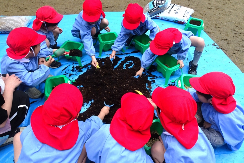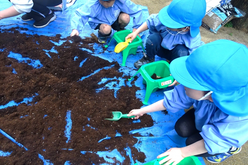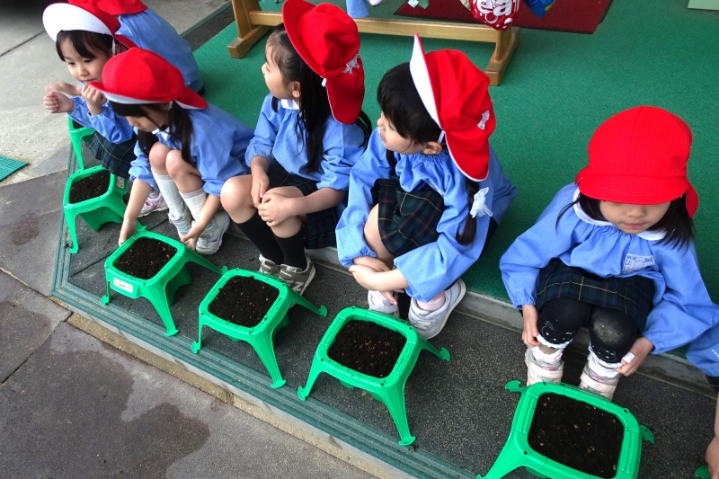 年長組の子ども達は園庭でプランターにミニトマトの種を蒔きました。