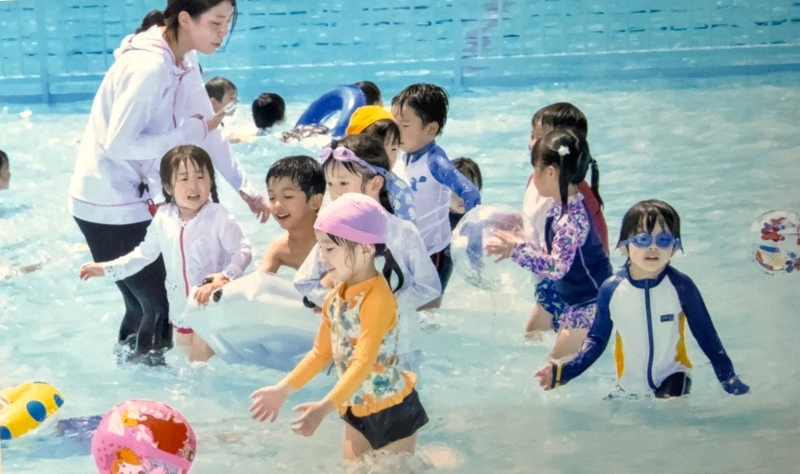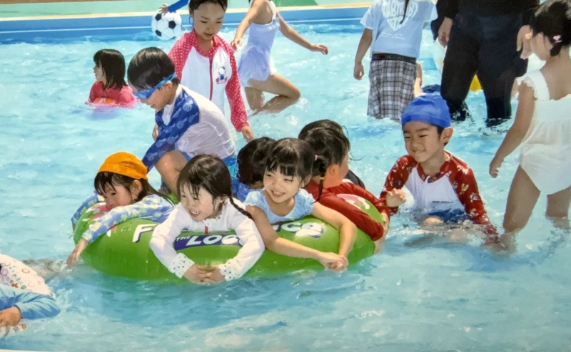 気温が高く、こまめな水分補給をしながら、プールに入っては水の冷たさを心地よく感じたようです。フープを使ってクラス対抗ゲームをしたり、浮き輪で遊んだり、夏の遊びを楽しみました。