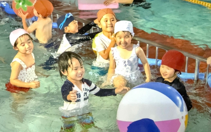 初めて屋内プールに入る子ども達も、丁寧に教えてくださるコーチの方々に安心して、水につかったり、バタ足をしたりして、水遊びを楽しみました。